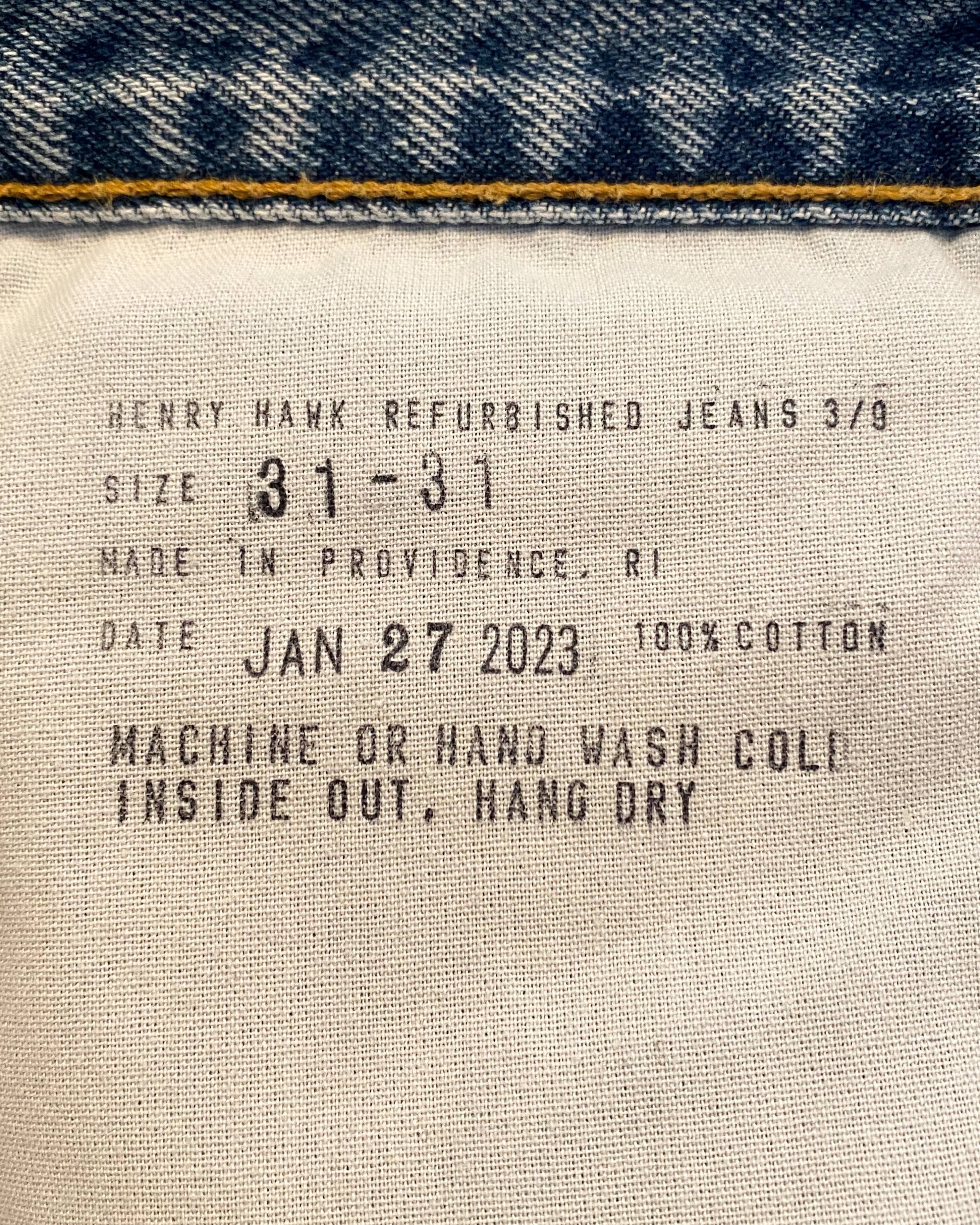 Showing Left Pocket Bag of Jean 3/9. Each Jean has its edition number, size, and washing instructions stamped here.