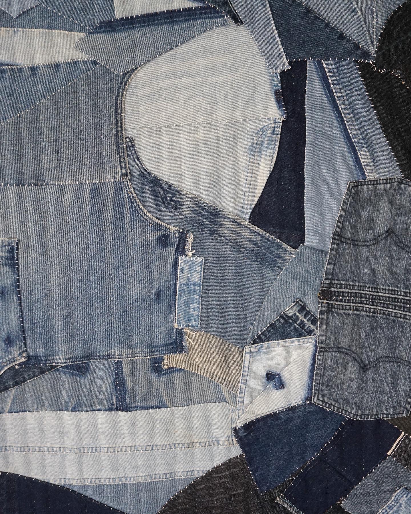 90s, and vintage dress shirts for the lining. It’s rich with patchwork, reweaving, hand sewn details, repair marks and signs of the previous wearer. I try to celebrate and showcase the beauty that is within the marks of a well worn garment. It’s a playful but precise rearrangement of recognizable Jean elements, (pockets, belt loops, yokes) in order to give the worn out pants a new life.